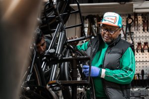 ,,Het begon met kleding en al snel bleek er ook behoefte te zijn aan fietsen”, vertelt Renzo in de Warme Kamer, waar ondertussen een oudere man met rollator binnenstapt die de vrijwilligers vrolijk één voor één begroet. ,,Dagelijks kwamen vluchtelingen van de opvanglocatie in Harskamp met de bus naar onze winkel om een goedkope fiets op te halen, die we gedoneerd kregen van particulieren. Soms stonden mensen een uur voordat we opengingen al voor de deur te wachten, zo graag wilden ze een fiets.” Omdat niet alle Oekraïeners konden fietsen – en degenen die het wel konden er soms bijzondere verkeersregels op na hielden – startte de stichting al snel met fietsles, in samenwerking met Welzijn Barneveld. ,,Dat doen we nu nog steeds.”